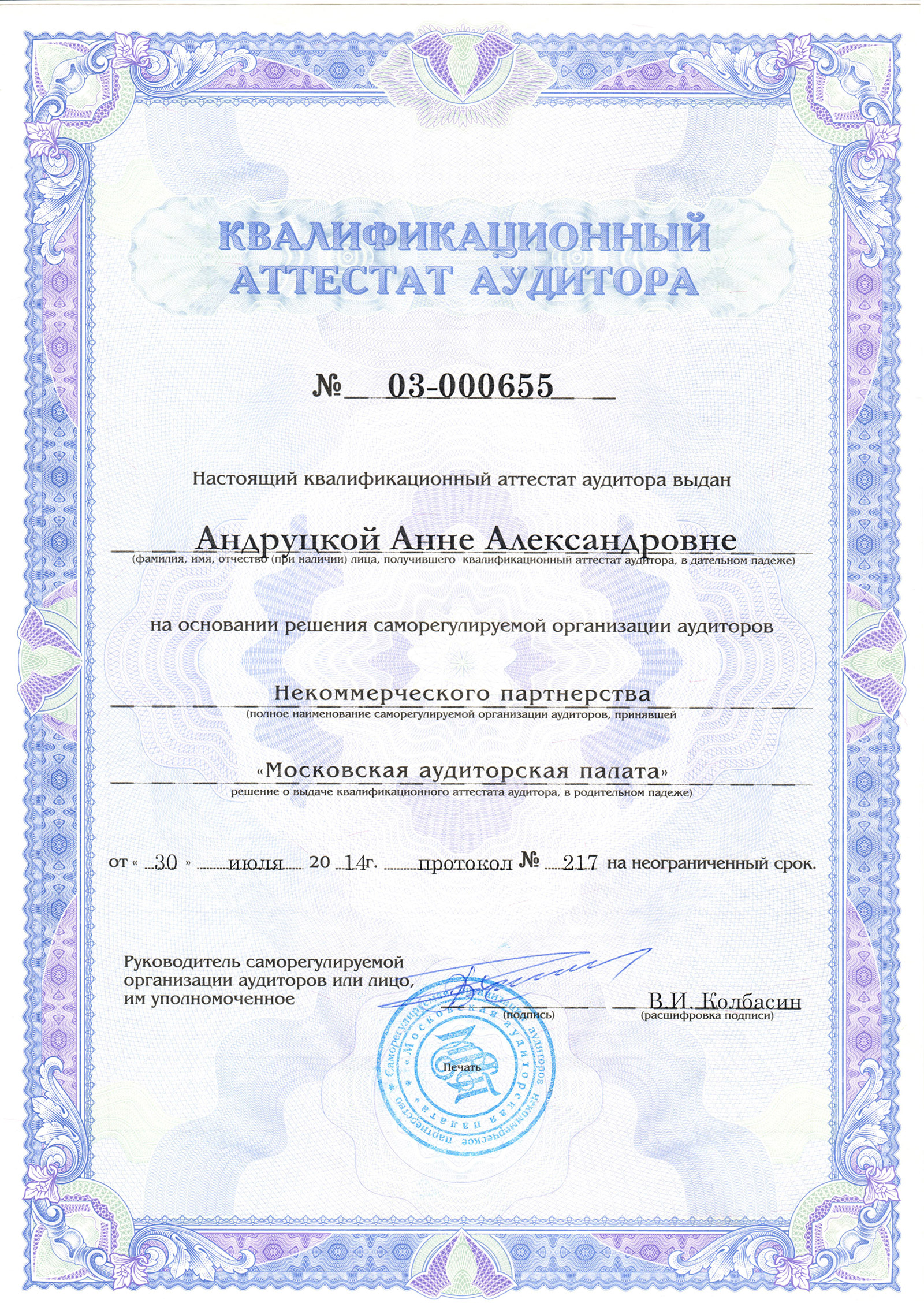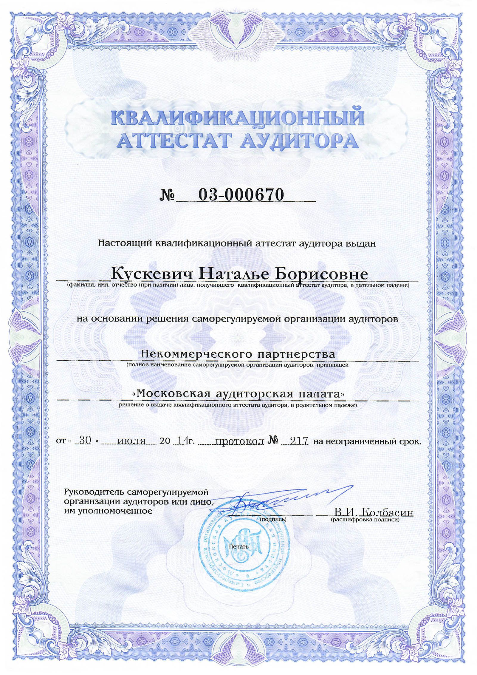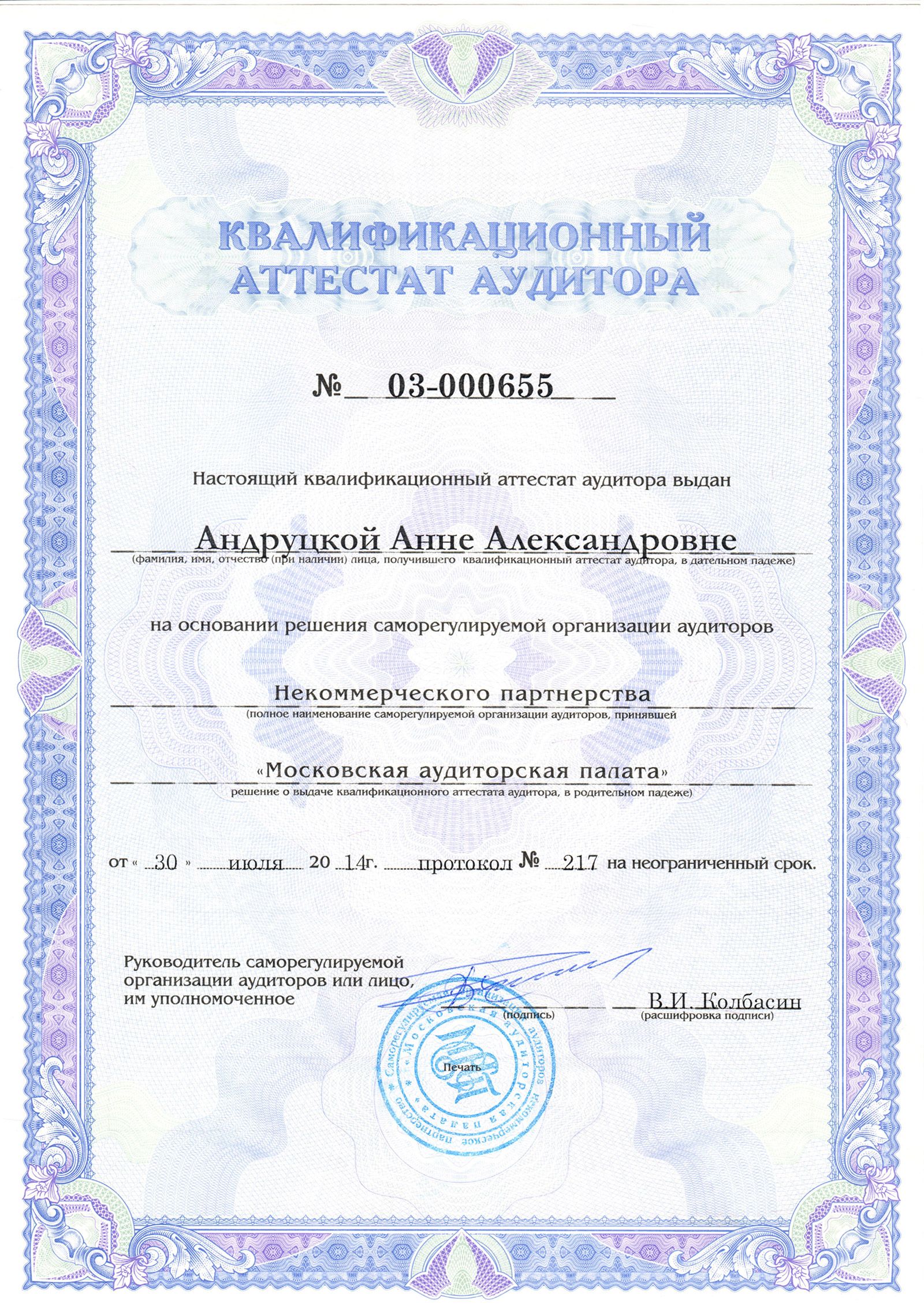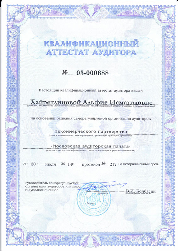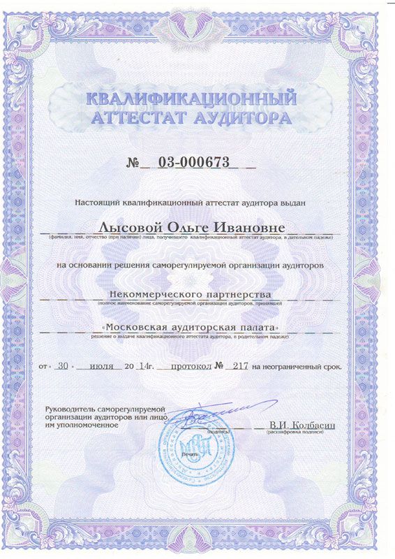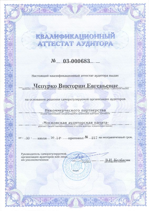 Квалификация: Аудитор, квалификационный аттестат № 03-000683, выдан СРО Некоммерческое партнерство "Московская Аудиторская Палата";