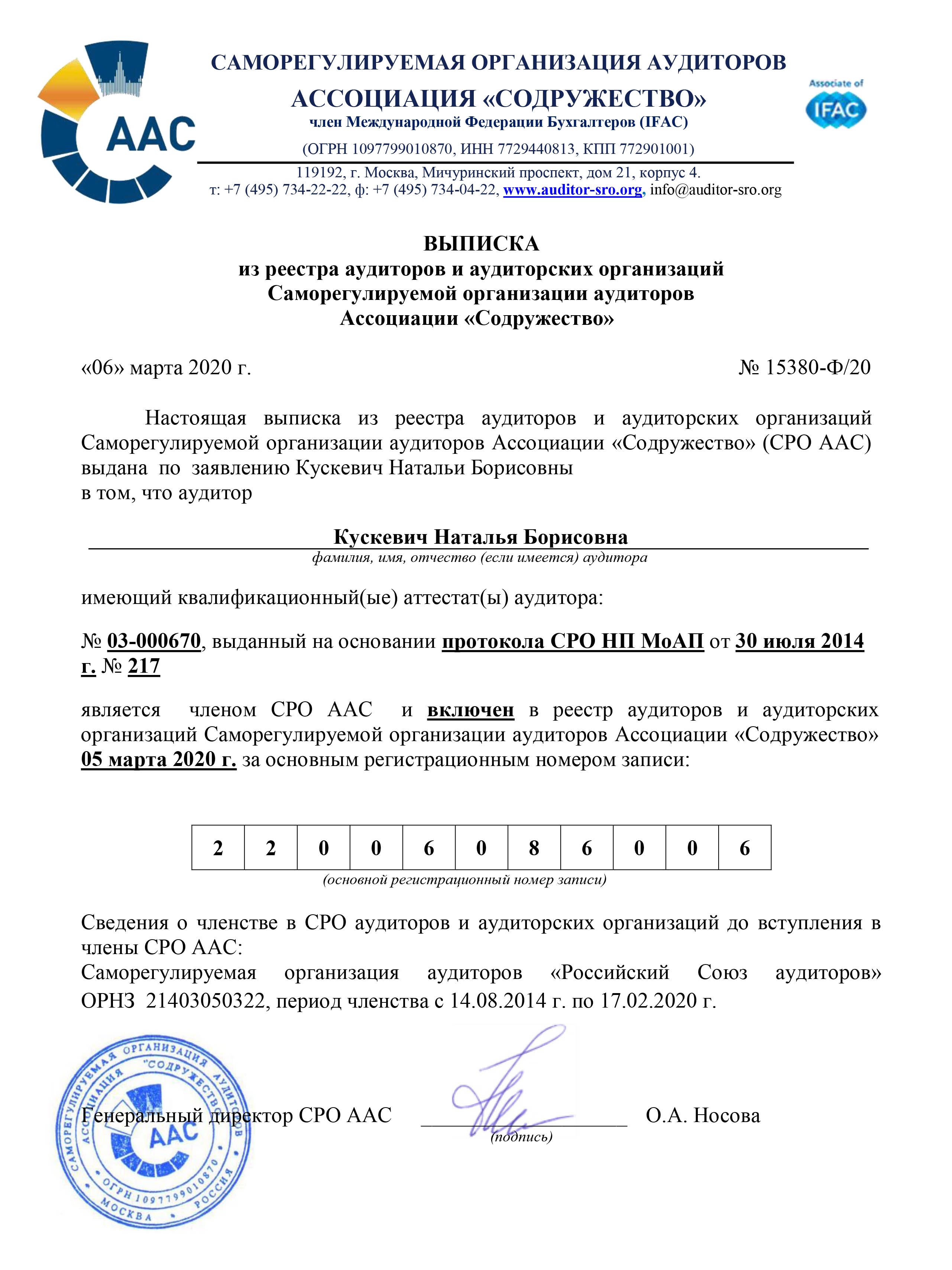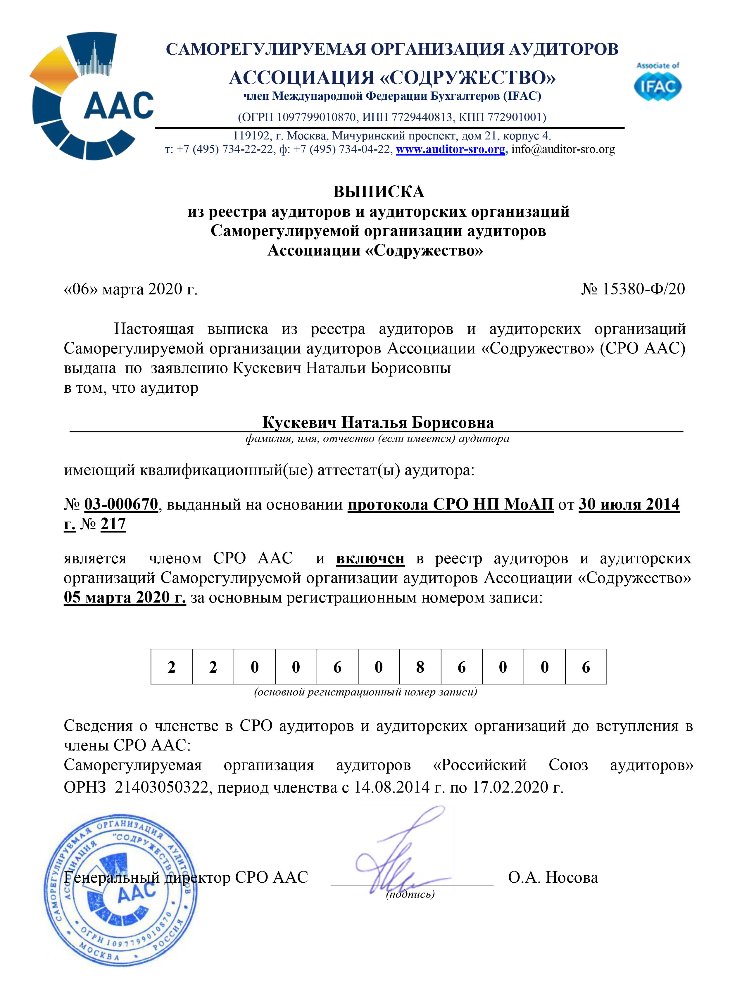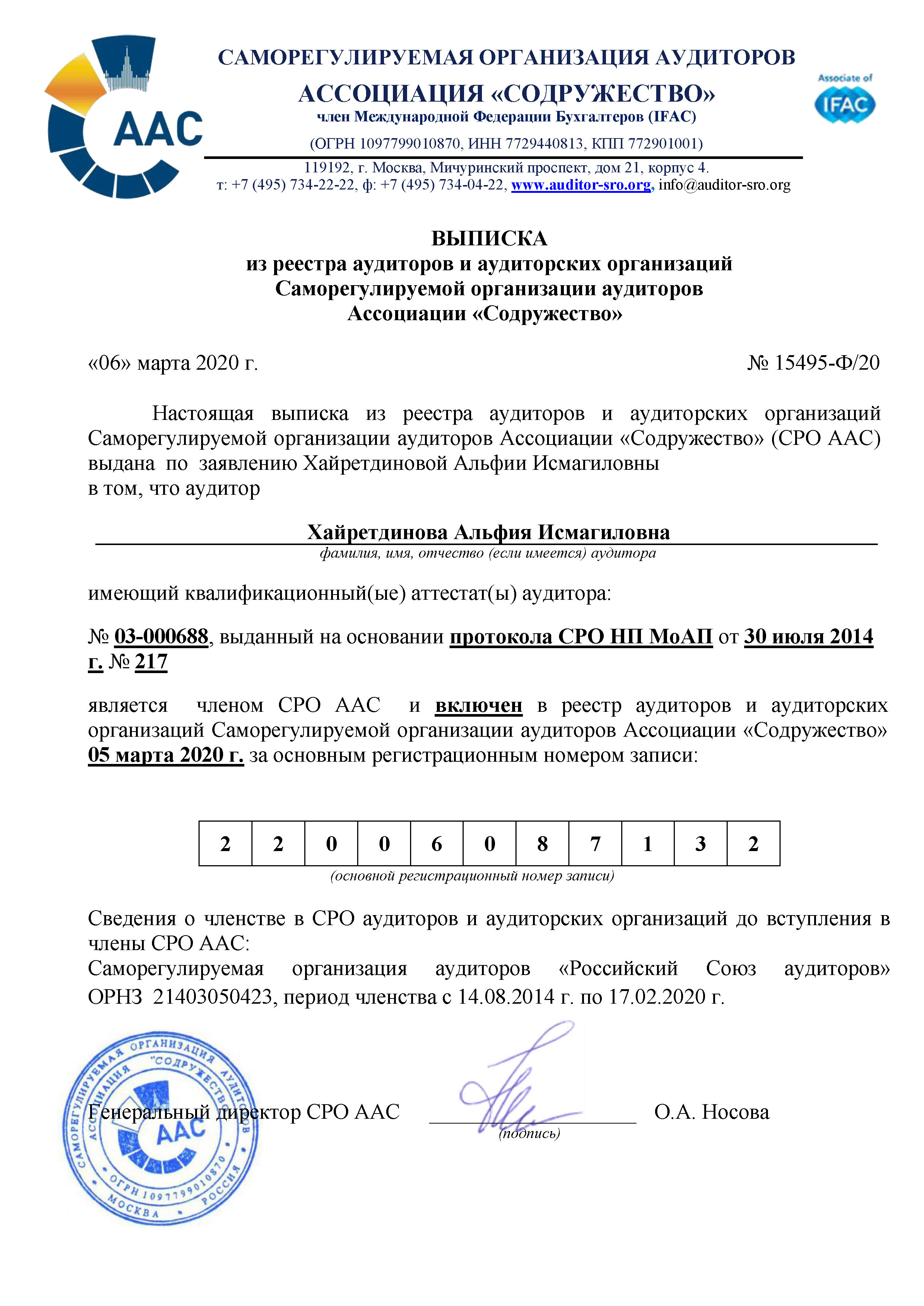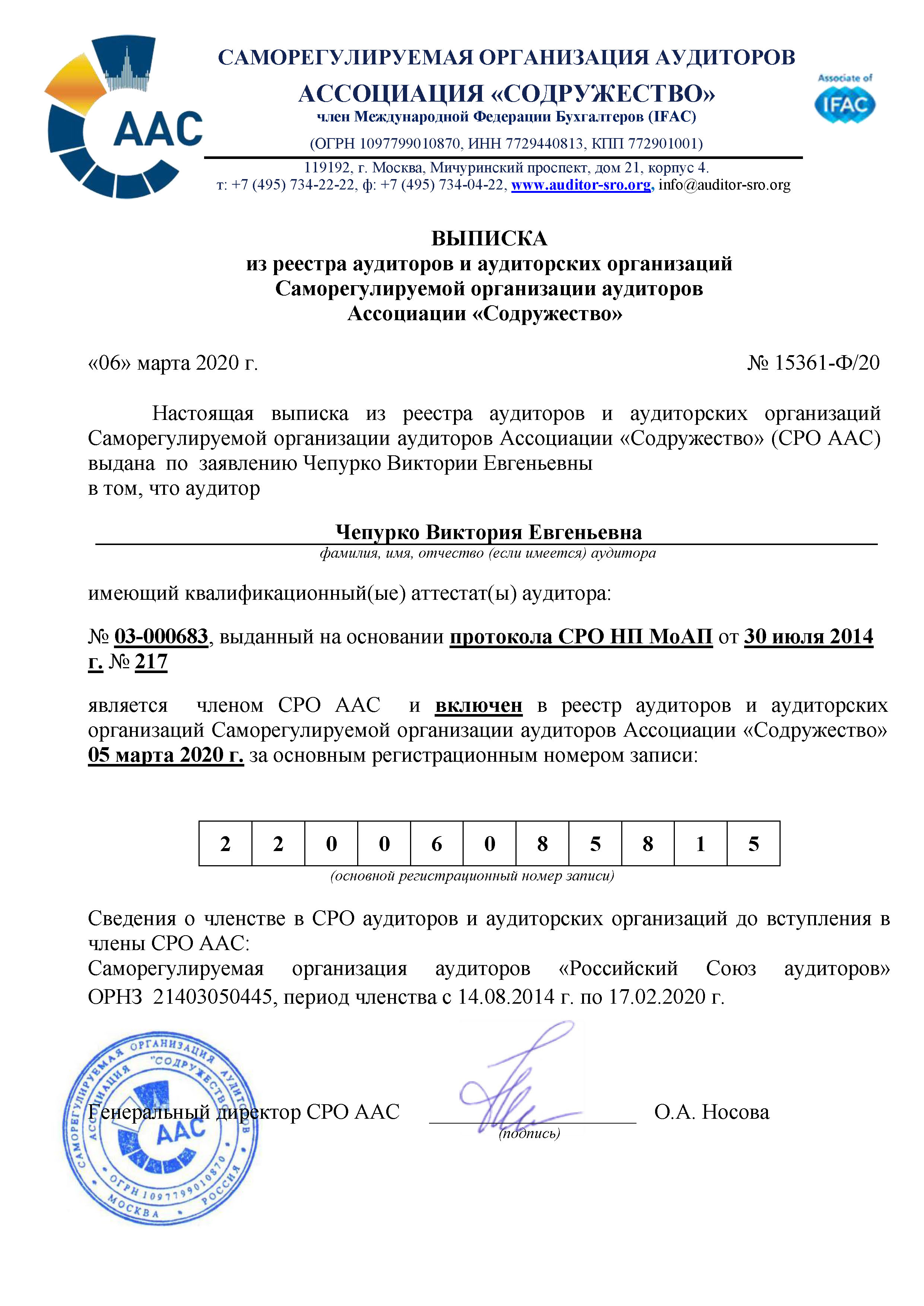 Общественная деятельность: Член Саморегулируемой организации аудиторов Ассоциация "Содружество" (СРО ААС).